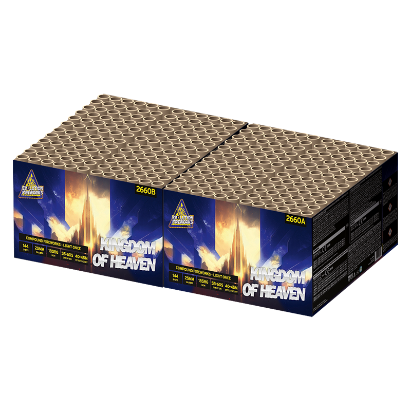 De Kingdom of Heaven van Evolution Fireworks is een set welke bestaat uit twee compounds met ieder 144 schoten siervuurwerk. In totaal dus een set van maar liefst 288 schoten! Met eerst deel A, gevolgd door deel B zet u een ultra spectaculaire vuurwerkshow neer! Zet dit hemelse kingdom ook bij u in de straat!
