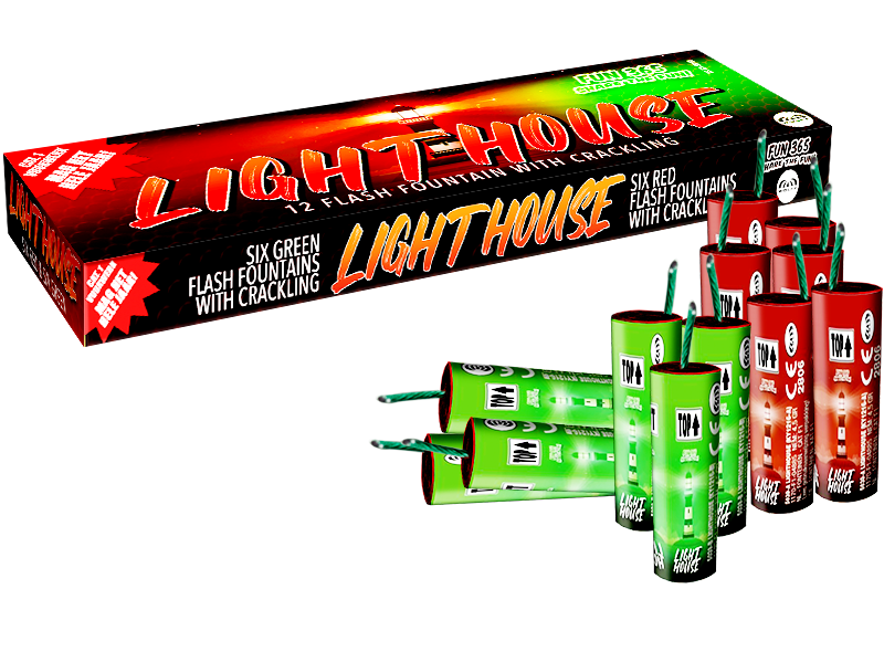 Lighthouse n6 rode en 6 groene flash fonteinen met crackling. n nKruitgewicht 54 Gram nTube diameter – nBrandtijd – Seconden nHoogte – Lighthouse Goedkoop vuurwerk kopen bij Vuurwerkwinkel Helmond