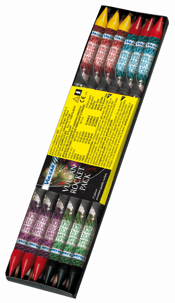 Een assortiment met middelgrote vuurpijlen. 12 stuks gesorteerd in een doos. n nVulcan Rocket pack is een product van Vulcan Europe. nKleine vuurpijlen verpakt in een doosje. n12-delig vuurpijlenpakket met diverse vuurwerkeffecten. n12 vuurpijlen – 4 effecten – 7,7 gr NEC per vuurpijltje Vulcan Rocket pack Goedkoop vuurwerk kopen bij Vuurwerkwinkel Helmond